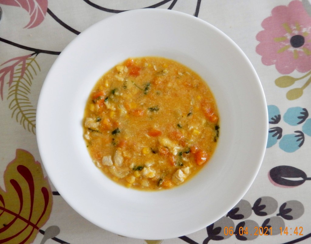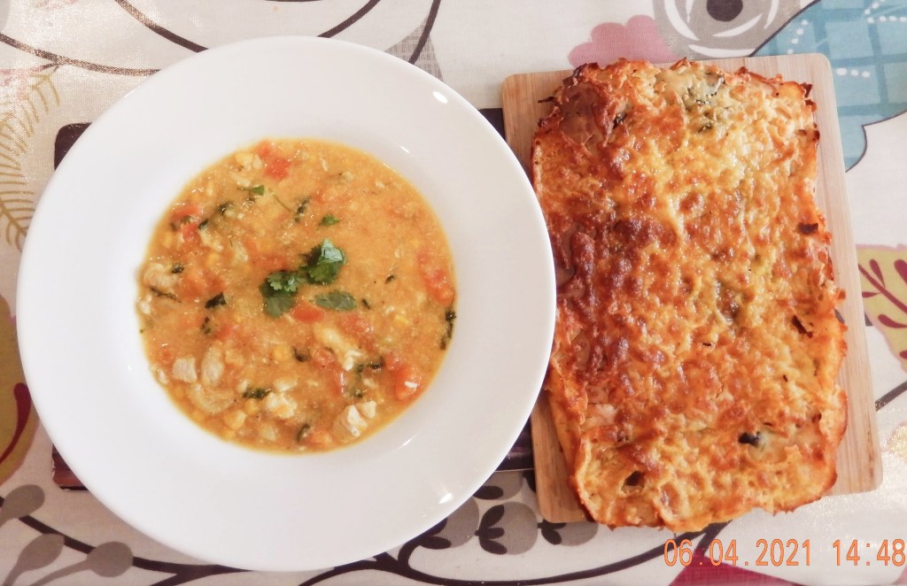 The chicken chowder and the cheesy cornbread turned out wonderful. All the different flavours in the chowder really came together, and the cornbread was really filling. Possibly the most adventurous dinner we’ve had on a Tuesday!