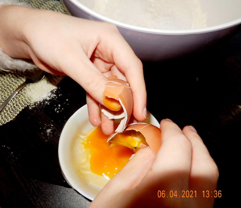 Cheesy Cornbread: We didn’t have muffin trays so we used a baking tin for the cornbread. This was very easy to make. We didn’t have any polenta or cornmeal so we used plain flour. Little Miss Nine mixed the flour with baking powder. To this she added 2 eggs beaten with buttermilk and honey. (We lost one egg during this)