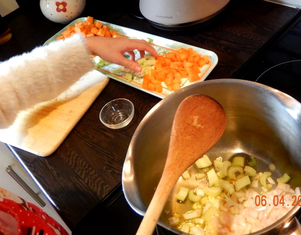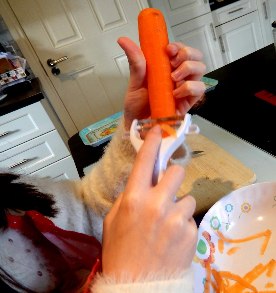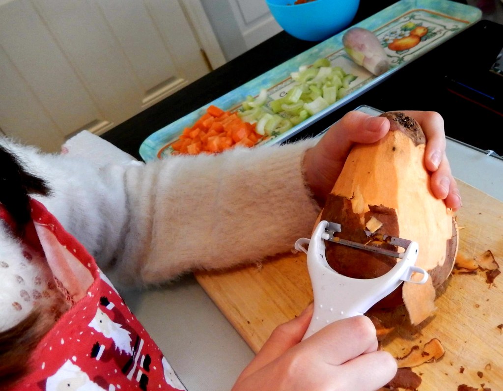 Chicken Chowder: Stephano gets nervous when his wee girl uses a sharp knife. I noticed how much better she was today at chopping. Very confident! The vegetable peeler was a little tricky. Easy enough with the carrot but the sweet potato was more challenging. Even I struggle to peel a sweet potato; they’re lumpy and quite hard. Fair play to her though, she persevered. (Stephano left the building)