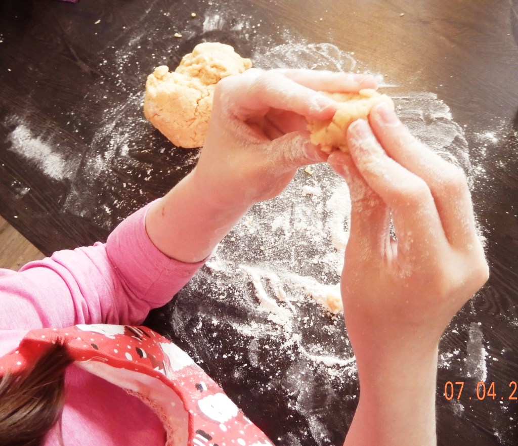 Not sure what went wrong here…but it was very crumbly. I got her to add a wee bit of water to the dough and that did the trick. She rolled it into balls. Simple!