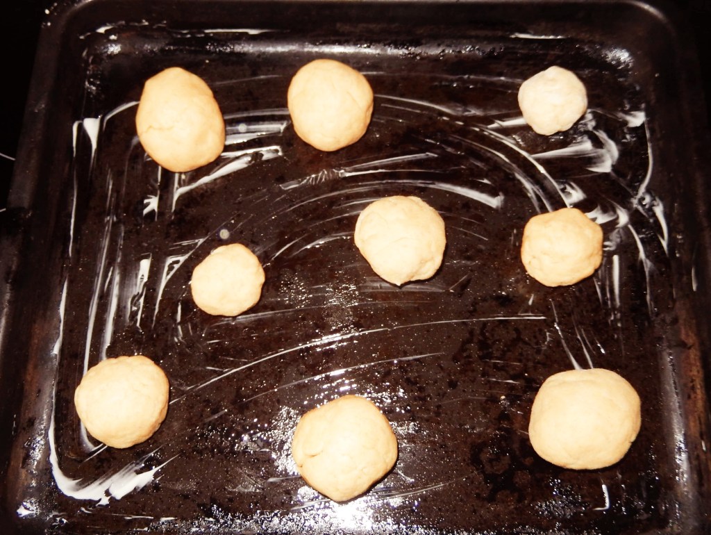 At this point I realised we had run out of parchment paper. So we put the balls on a greased tray. (There’s always more ways than one)