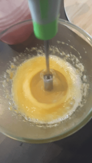 As that was melting, she whisked the egg and sugar. She was in a very giddy mood today so I’m glad todays recipe wasn’t too tricky.