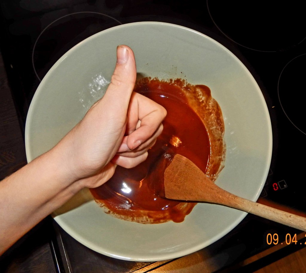 She made the chocolate fondants first. Very easy for a child to make. Miss Nine often made rice krispie buns so melting the chocolate and butter over a bain-marie wasn’t new to her.
