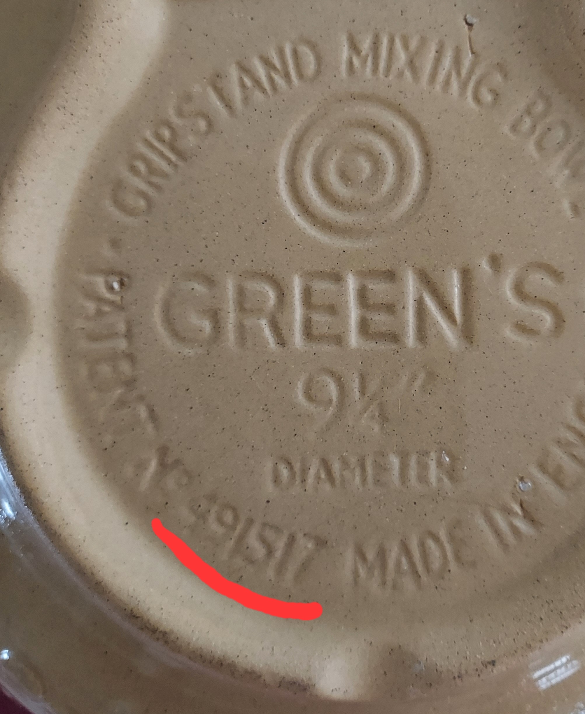 They were made by T.G. Green & Co. Ltd, which was established in 1864 in Derbyshire. The patent of this one #491517 was granted in 1913. The patent aspect of these bowls are the hand grips on each side and the flat panel on the bottom. The panel allows the bowl to sit at an angle for easy mixing.