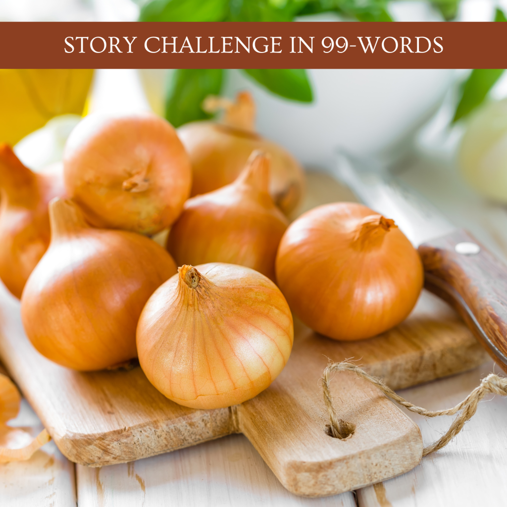 Written for Charli’s 99-word story. February 27, 2023, prompt: In 99 words (no more, no less), write a story about a golden onion. Any golden onion. One planted or harvested. An onion chopped for a meal. How can you use an onion as a prop in a character’s hand? Go where the prompt leads! I have a TRUE story for this one!