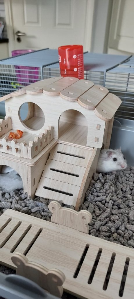 ‘Welcome to your new home, Mabel,’ the small one says. She gently lowers me into a cage. A house all to myself. Exactly what a hamster needs!
