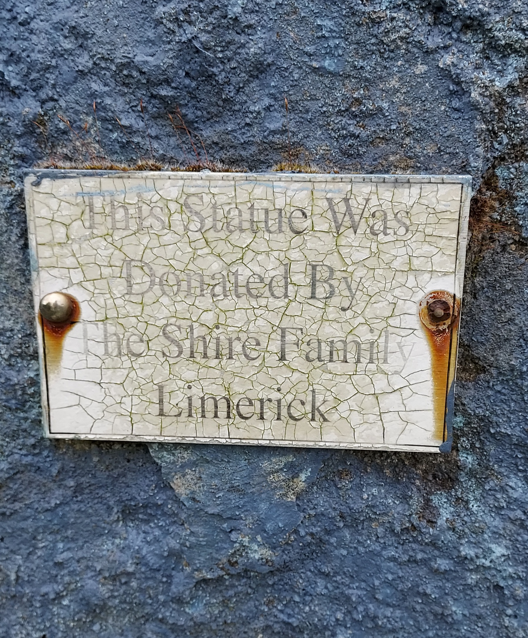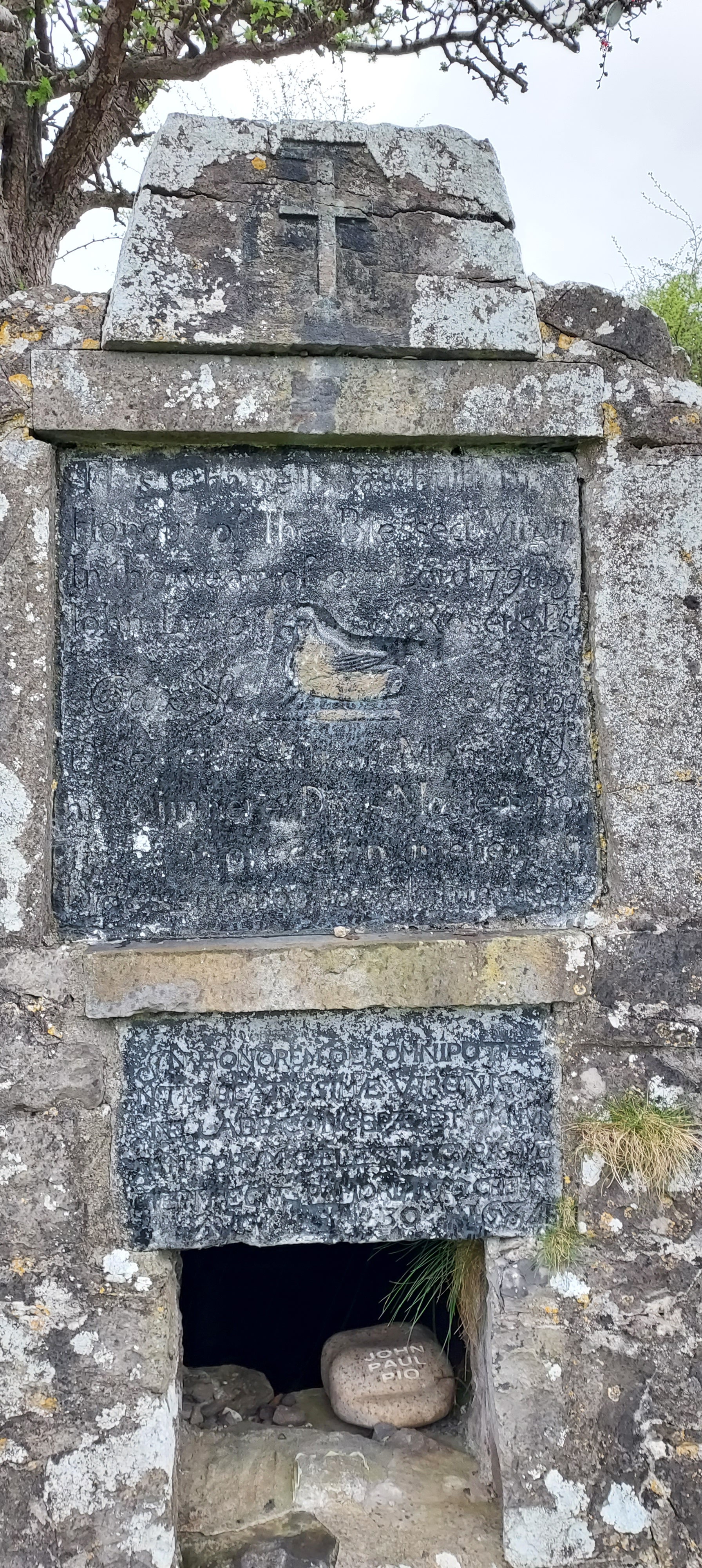 The Holy Well is cocooned in a little stone house. On the front there’s an engraving of the words; “This chapel was built in honour of the Blessed Virgin in the year of Our Lord 1799 by John Lynott of Roserk.” Beneath this inscription is a carving of a dove bordered either side with the motto “Peace and Love,” under which are two Latin inscriptions.