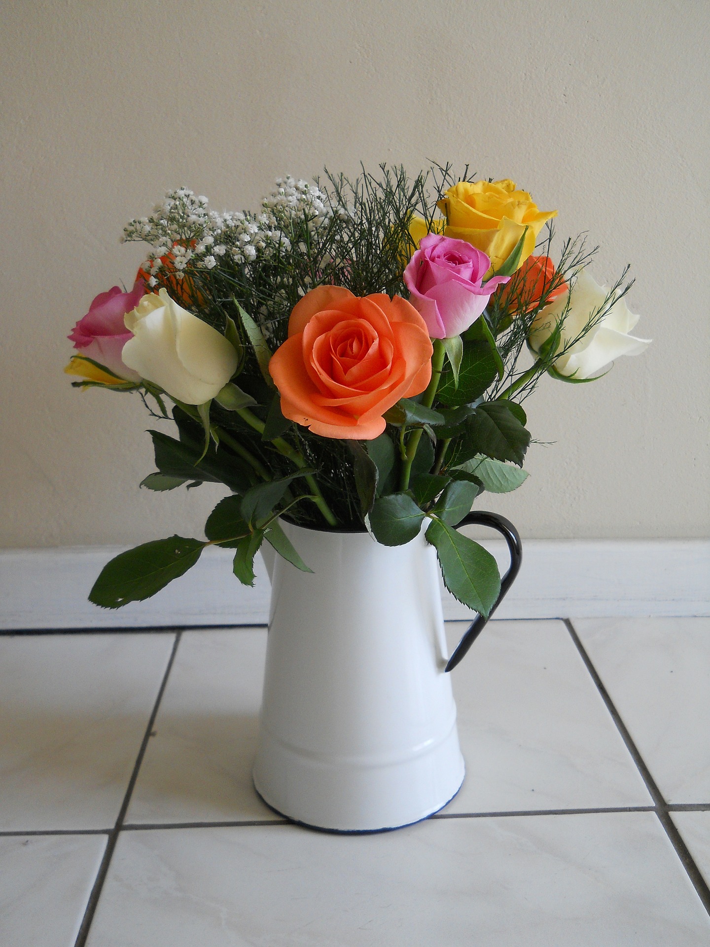 My husband found this vintage enamel jug in the old hen house at his grandfather’s derelict house. After cleaning it up, we thought about trying to remove the rusty bits. But we decided not to, as it adds to its old-fangled charm.
